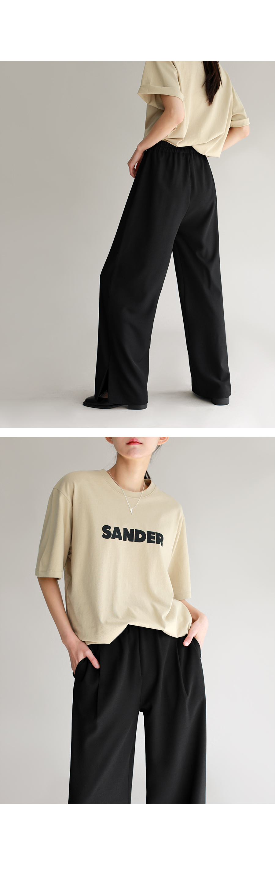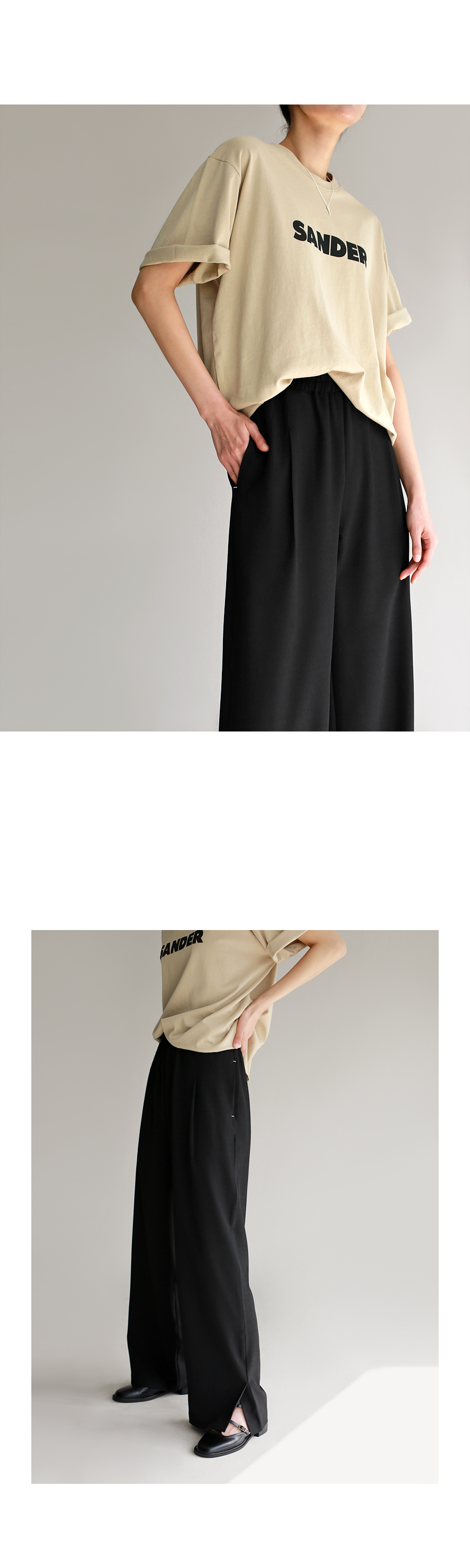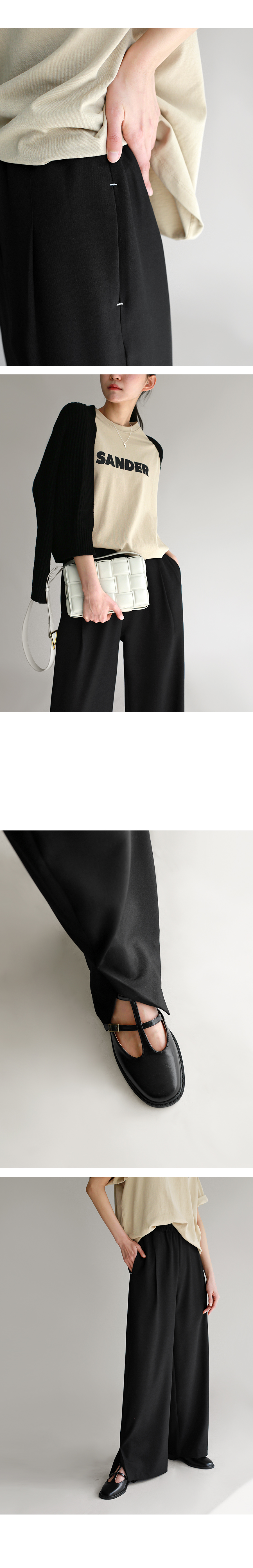 | 모델 착용정보 | J.Y 모델 (키 167cm, 상의 마른 55, 하의 26 inch, 신발 240mm) : 아이보리, 크림, 블랙 E.A 모델 (키 168cm, 상의 마른 55, 하의 25 inch, 신발 240mm) |