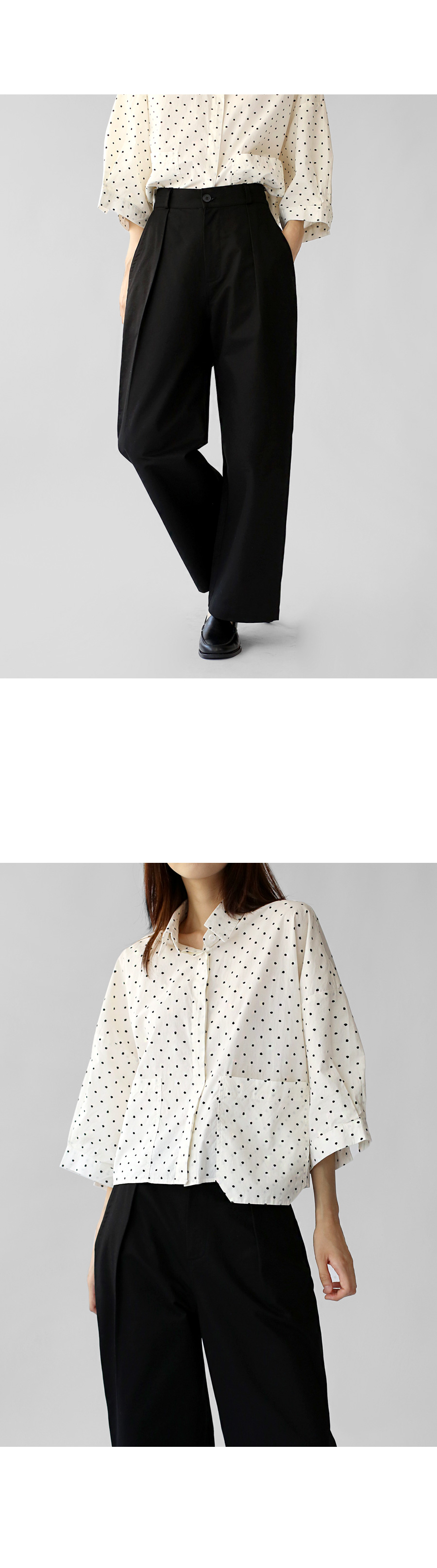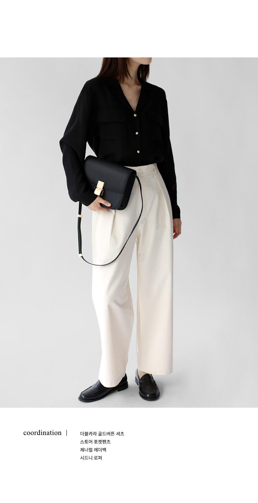 | 모델 착용정보 | J.Y 모델 (키 167cm, 상의 마른 55, 하의 26 inch, 신발 240mm) E.A 모델 (키 168cm, 상의 마른 55, 하의 25 inch, 신발 240mm) : 블랙, 크림 |