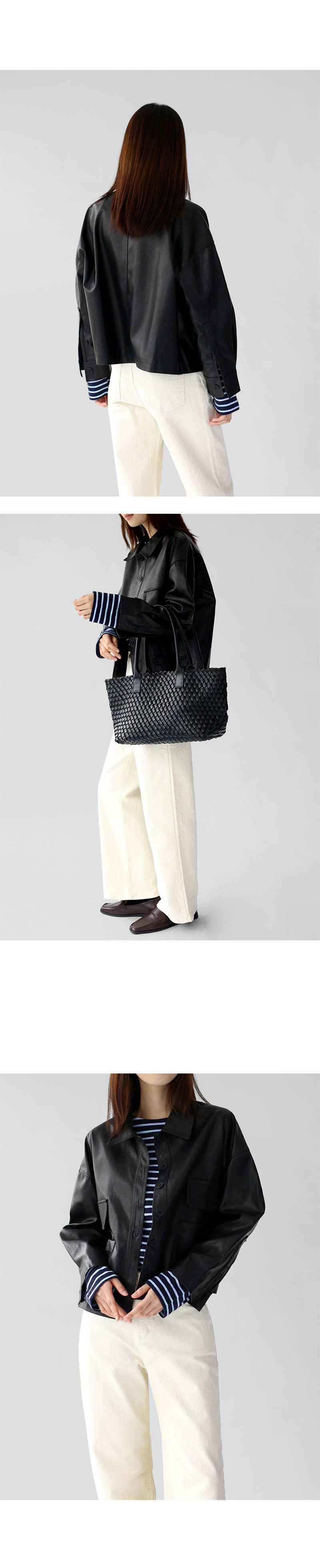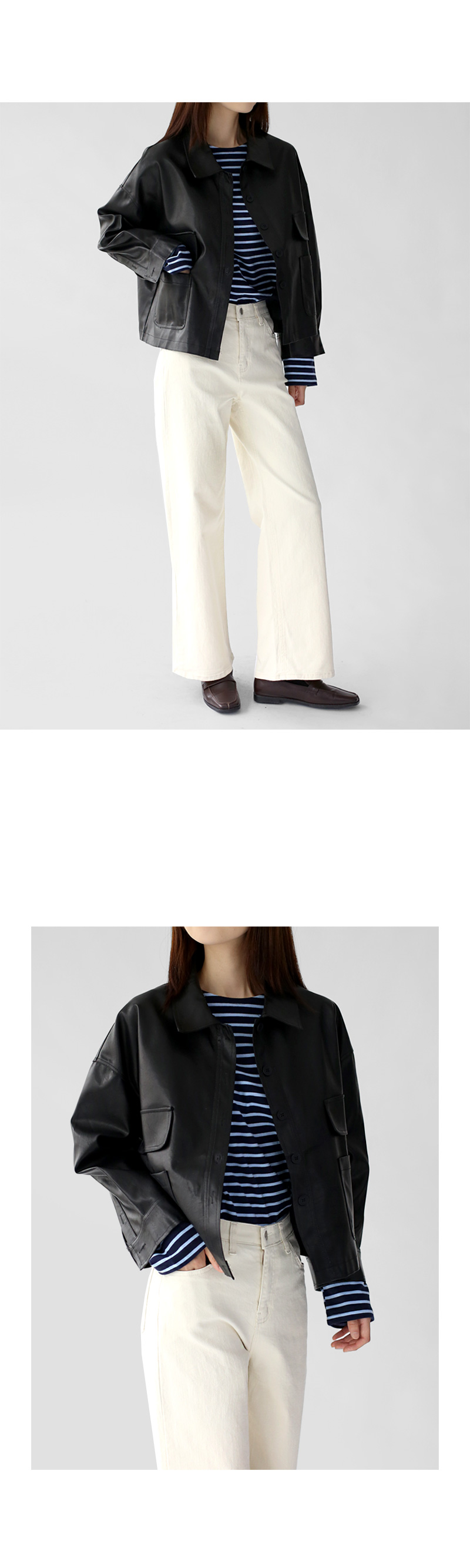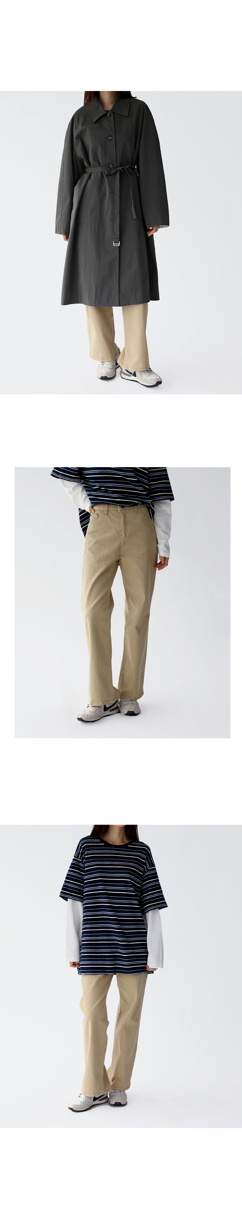 | 모델 착용정보 | J.Y 모델 (키 167cm, 상의 마른 55, 하의 26 inch, 신발 240mm) E.A 모델 (키 168cm, 상의 마른 55, 하의 25 inch, 신발 240mm) : 크림아이보리, 베이지, 블랙, 브라운 |