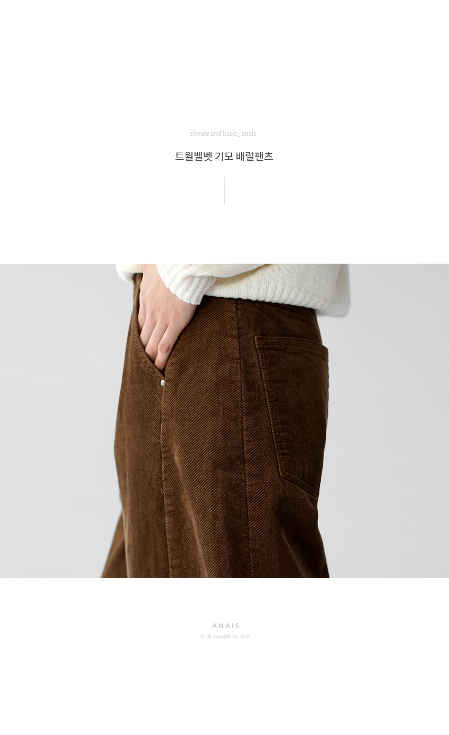 | 모델 착용정보 | J.Y 모델 (키 167cm, 상의 마른 55, 하의 26 inch, 신발 240mm) E.A 모델 (키 168cm, 상의 마른 55, 하의 25 inch, 신발 240mm) : 카멜베이지, 크림아이보리, 브라운 |